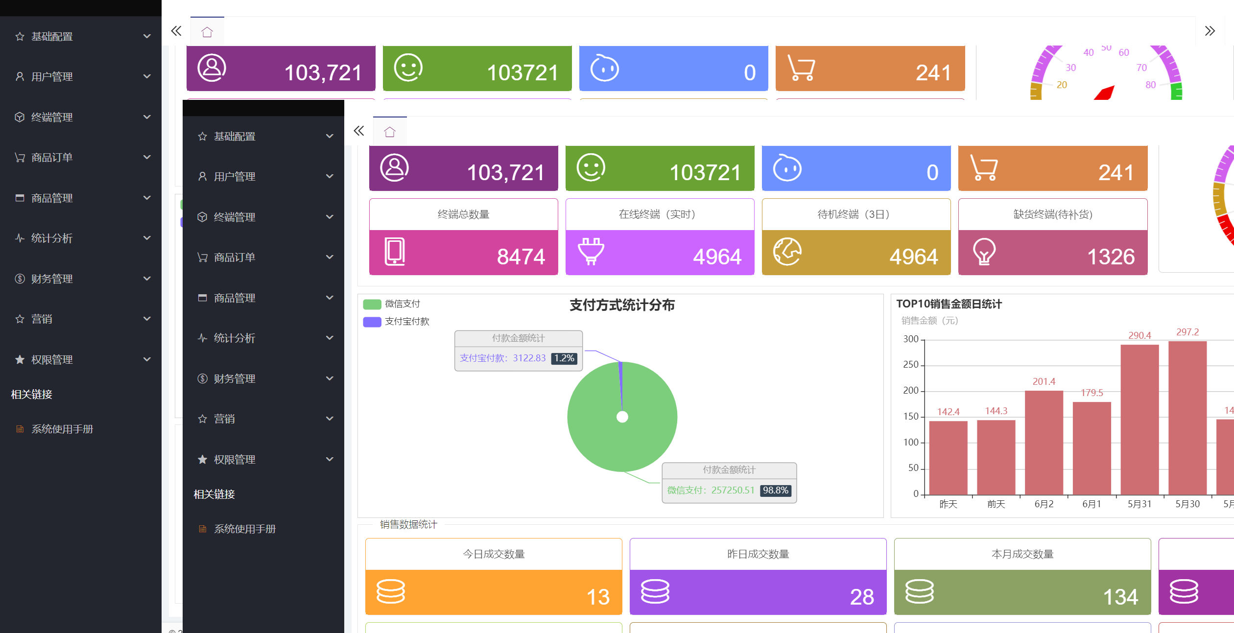 扫码支付+终端管理+货道管理+商家管理+维护管理+商品管理+订单管理